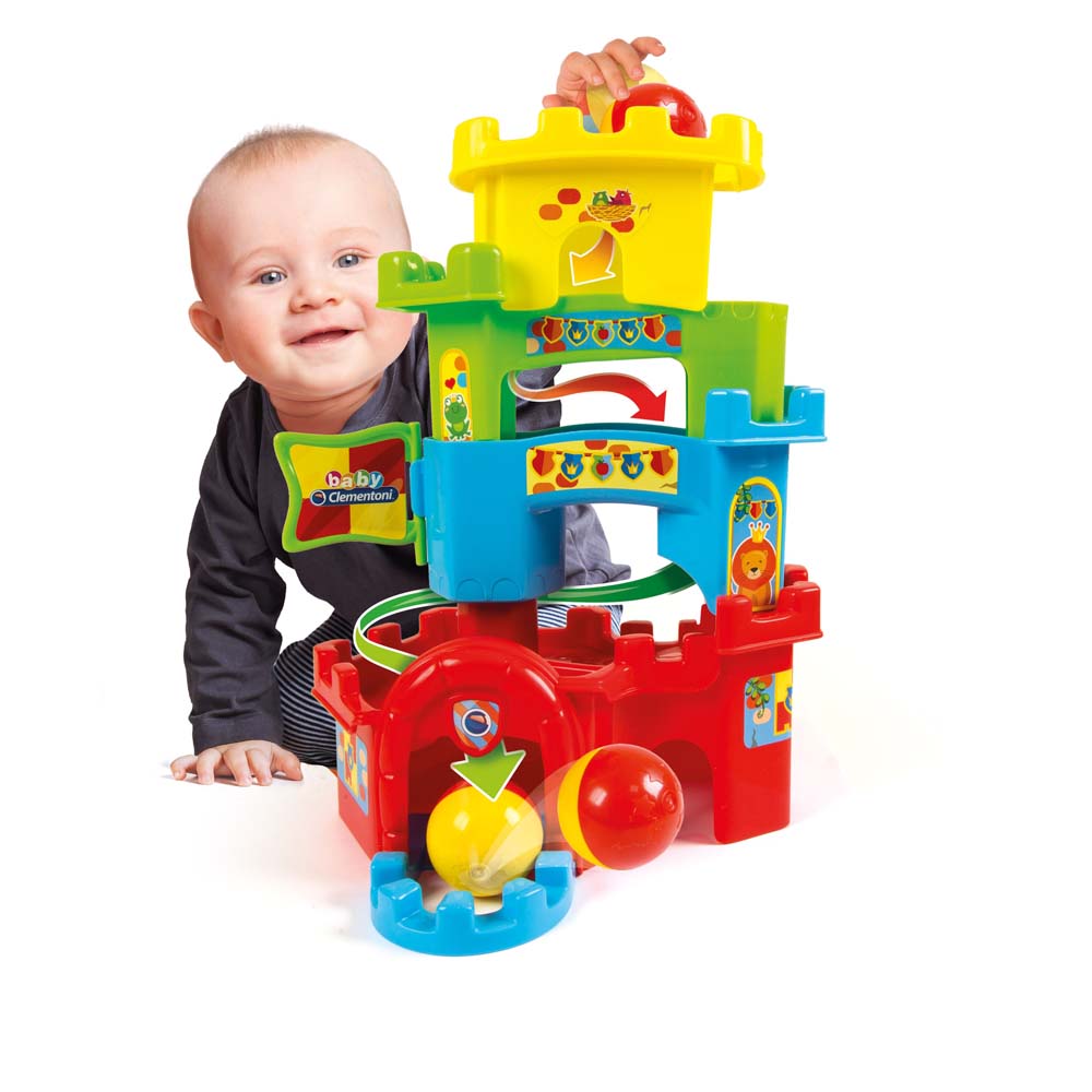 Bébé dépose la balle en haut du château et la regarde ensuite dévaler le château d’étage en étage.